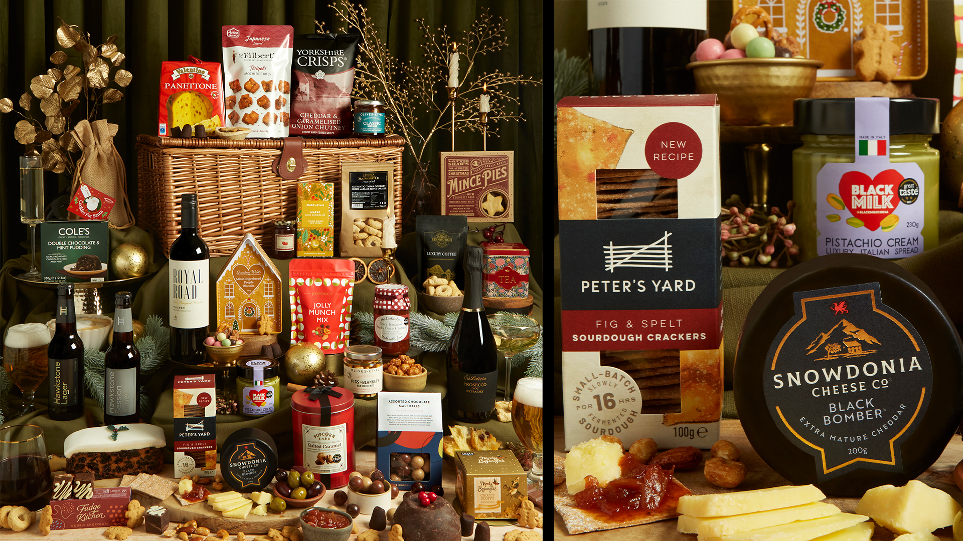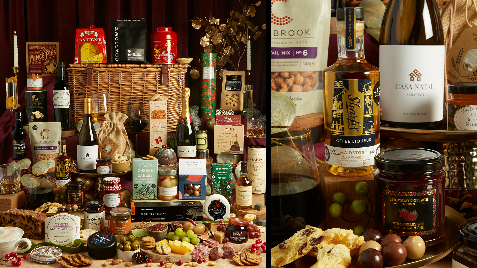 Inside, they’ll discover drinks for every taste, from Bollinger Champagne, award-winning wines and port to Balvenie DoubleWood 12 whisky and a decadent toffee liqueur. An impressive savoury spread of Snowdonia cheese, crackers, Italian taralli, jams, chutneys and Michelin-starred salami sits alongside indulgent sweet treats, including citrus biscuits, Champagne Christmas pudding, rich fruit cake, peaches in Prosecco and a large panettone to share.