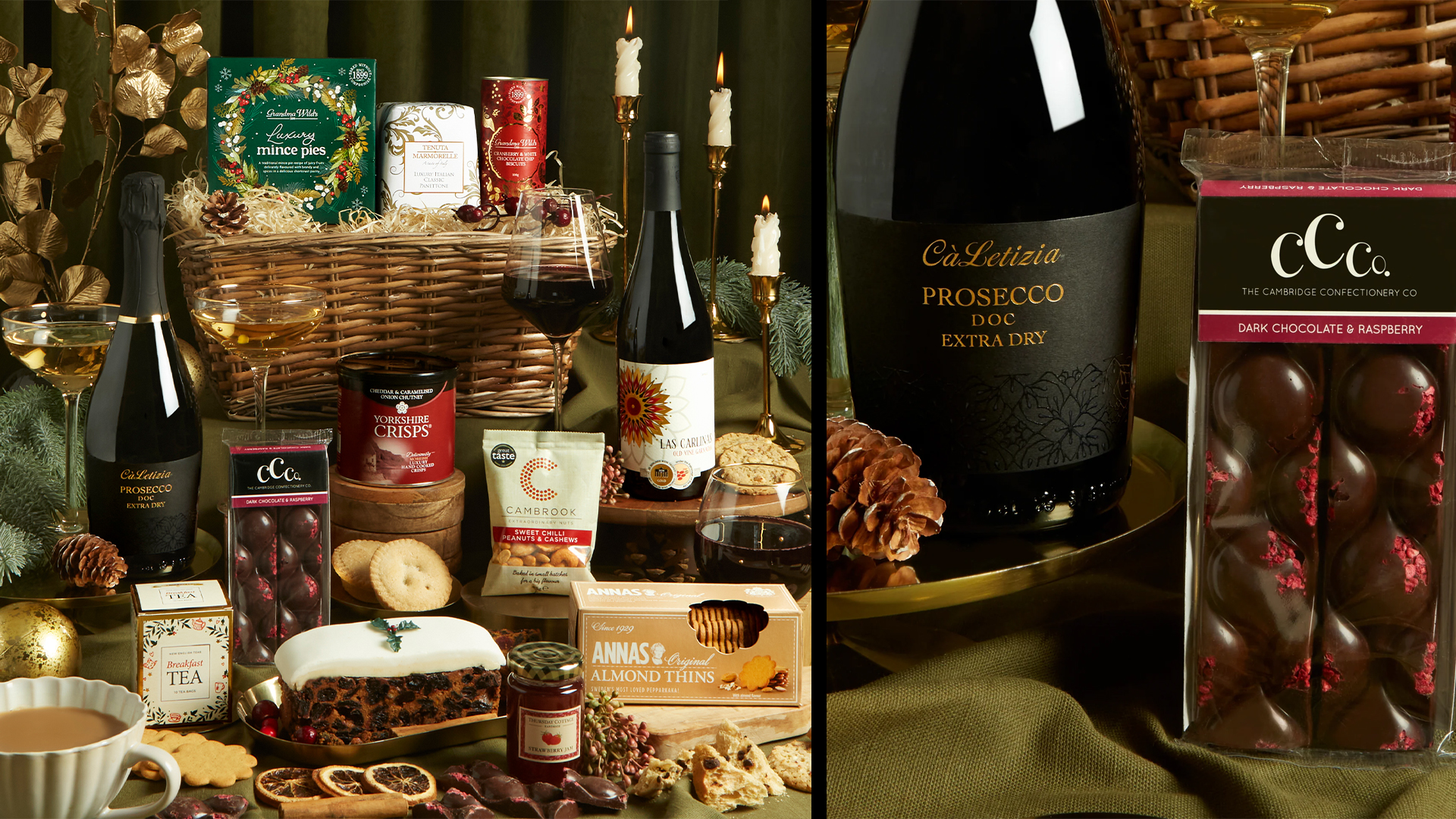 The perfect food and wine gift to show your loved ones just how much you appreciate them, featuring a bottle of Spanish Las Carlinas Garnacha and an extra-dry Italian Letizia Prosecco, exclusive to hampers.com. To accompany the tipples, we’ve included a selection of wonderfully festive treats for them to discover, from the brandy mince pies and rich fruit Christmas cake, to the cranberry and white chocolate cookies and indulgent raspberry dark chocolate bar. All of this is ready for them to discover inside a gorgeous willow basket.