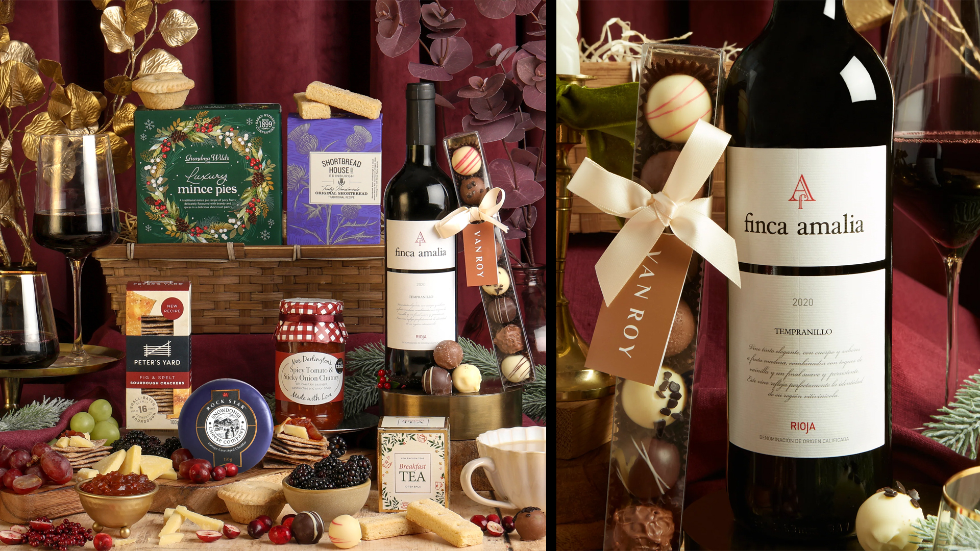 A generous festive feast in a wicker hamper, packed with something for everyone, including Malbec, Prosecco, two Hawkstone lagers and a mini bottle of port, plus luxury mince pies, Christmas pudding, panettone and fruit cake. You’ll also find Snowdonia Black Bomber cheese with sourdough crackers and chutney, artisan chocolates, truffles, fudge, biscuits, popcorn-style treats, coffee, tea, crisps, nuts and olives for serious family sharing.