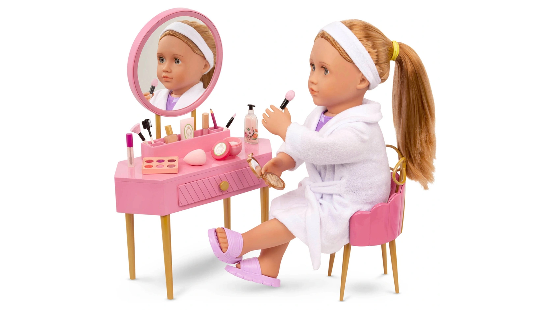 Get ready with this chic inspired, pink-and-gold vanity set, complete with a real mirror, roomy countertop, and pull-out drawer. Packed with 17 pretend beauty accessories, from mascara and lip gloss to eyeshadow, brushes and more. With built-in storage to keep everything tidy, this set is designed to aid imaginative play and is fully compatible with 46cm Our Generation dolls (sold separately).