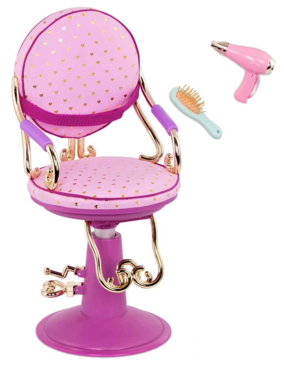 Take the salon home with this stylish pink, purple and gold chair, perfectly sized for Our Generation dolls. The included hairdryer makes fun sound effects for a realistic touch, while the brush and accessories are for styling, braiding and limitless play. Batteries are included, so the salon fun can start right away!